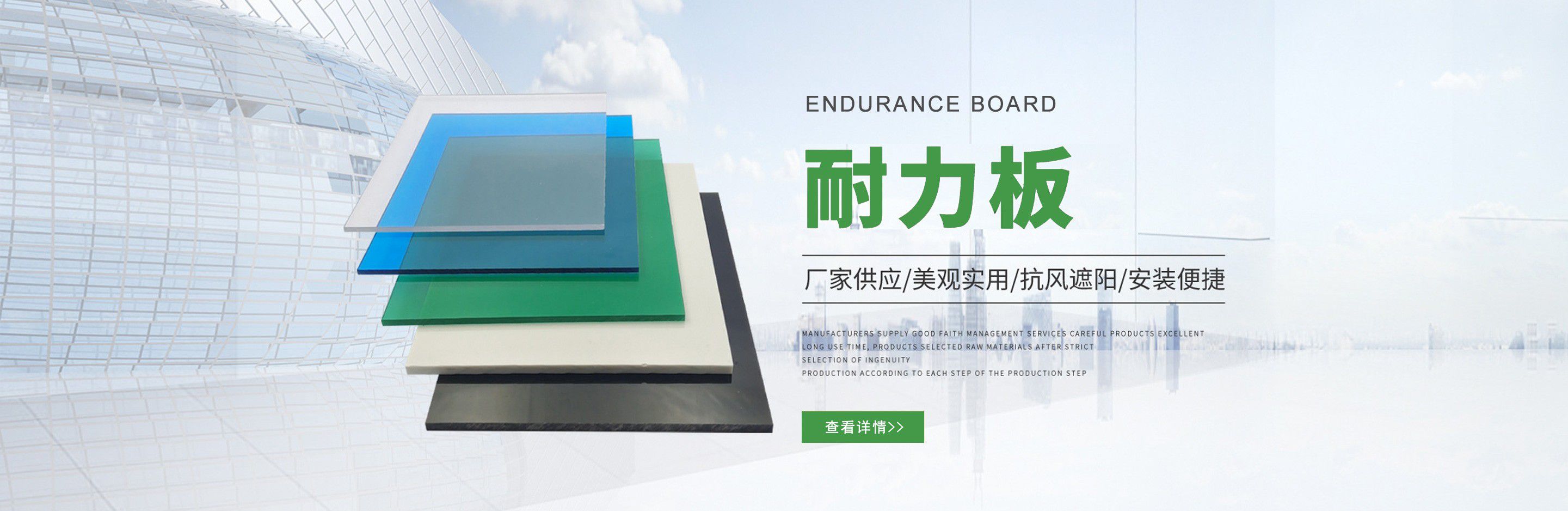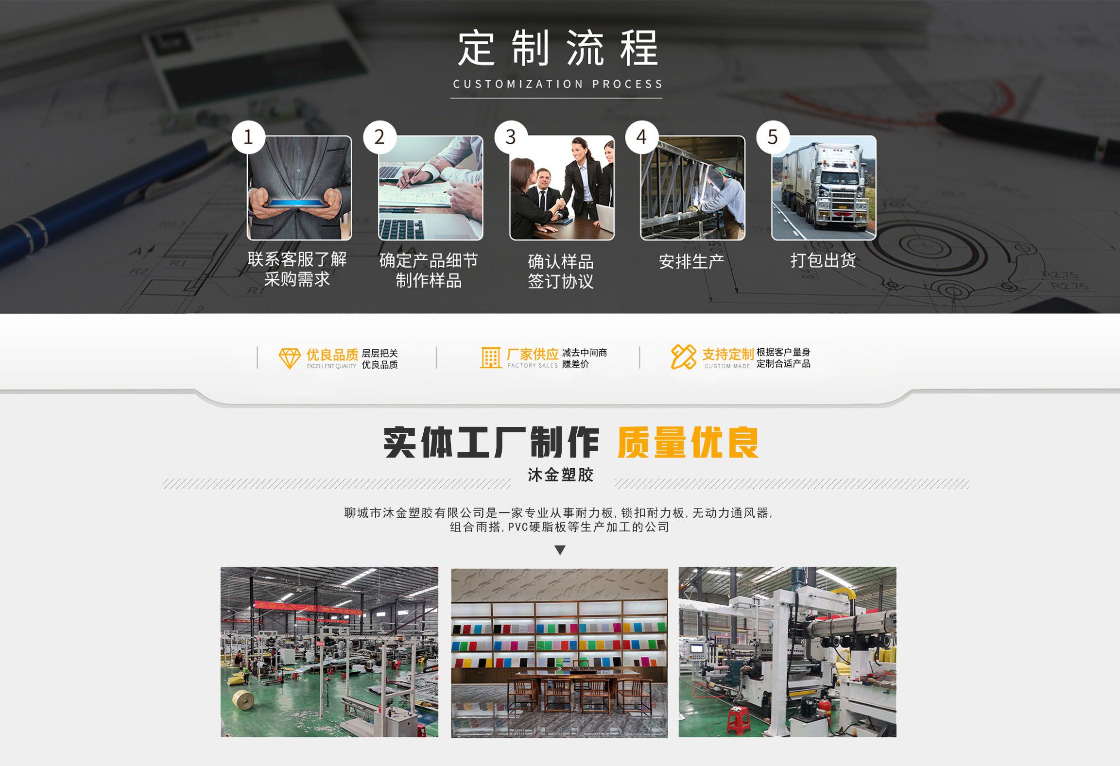 聊城市沐金塑膠有限公司注冊資金2180萬元,占地20000余平方,擁有自建廠房15000平方,員工100余名。10余年來,公司主營耐力板,鎖扣耐力板,耐力板深加工,無動力通風(fēng)器,組合雨搭,PVC硬脂板,耐力板廠家等板材的發(fā)展戰(zhàn)略,逐漸成長為綜合性企業(yè)。  公司擁有多條板材共擠生產(chǎn)線,采用世界知名品牌進口原材料和先進工藝,依據(jù)完善的ISO9001質(zhì)量管理體系和ISO14001環(huán)境管理體系,為產(chǎn)品的卓越品質(zhì)提供了強有力的保證。憑借過硬的創(chuàng)新能力和堅實的硬件基礎(chǔ),贏創(chuàng)已成為國內(nèi)領(lǐng)先的熱塑性板材生產(chǎn)商,產(chǎn)品被廣泛應(yīng)用于建筑業(yè)、農(nóng)業(yè)、工業(yè)、廣告業(yè)、安防行業(yè)及DIY領(lǐng)域。  公司始終致力于通過提供最優(yōu)的板材應(yīng)用解決方案,為客戶創(chuàng)造最高的價值;堅守創(chuàng)新、質(zhì)量、靈活、服務(wù)和速度的核心價值觀;堅持“完美的產(chǎn)品需要完美服務(wù)的支持”的經(jīng)營理念,努力實現(xiàn)成為世界領(lǐng)先的板材與解決方案供應(yīng)商的夢想。  在未來,公司將立足客戶需求,不斷改變和完善現(xiàn)有產(chǎn)品,拓展產(chǎn)品線和充分開發(fā)板材的應(yīng)用領(lǐng)域,為客戶創(chuàng)造全方位的價值。同時更好地實現(xiàn)員工的價值,實現(xiàn)公司團隊的價值。我們將與您一起創(chuàng)贏未來!  企業(yè)使命:成為世界領(lǐng)先的板材與解決方案供應(yīng)商。  公司愿景:通過提供最優(yōu)的板材應(yīng)用解決方案,為客戶創(chuàng)造最高的價值。  核心價值觀:質(zhì)量...